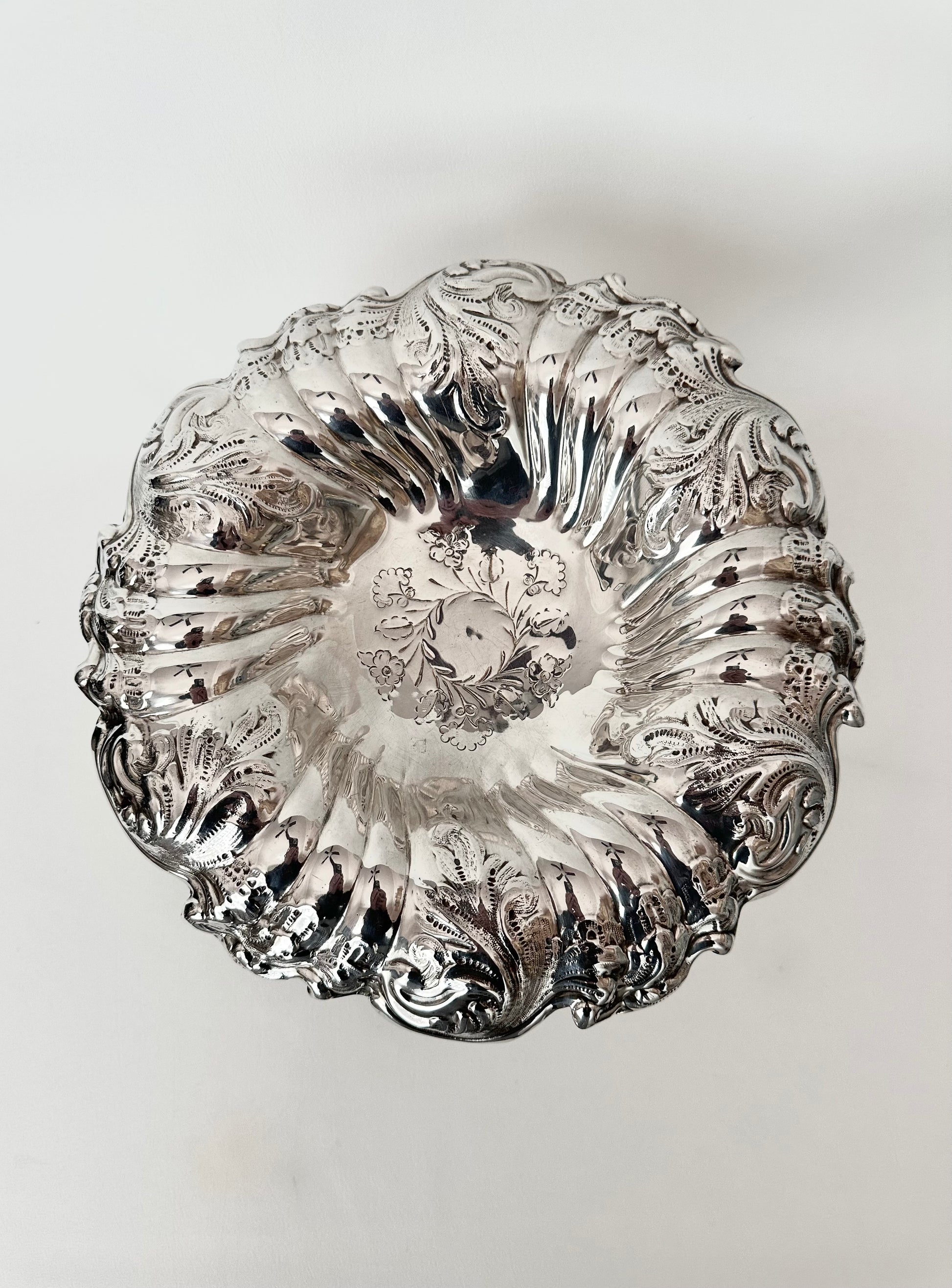 A true statement piece -- ornate, botanical embossed, engraved and scalloped! This silverplate pedestal dish will make anything in it the centerpiece. Fill it with fruit, Easter eggs, ornaments, or your shell collection -- truly a seasonless decorative vessel in our favorite finish. Uncovered at a nearby, stately home filled with the most unusual treasures -- a diamond in the rough!
