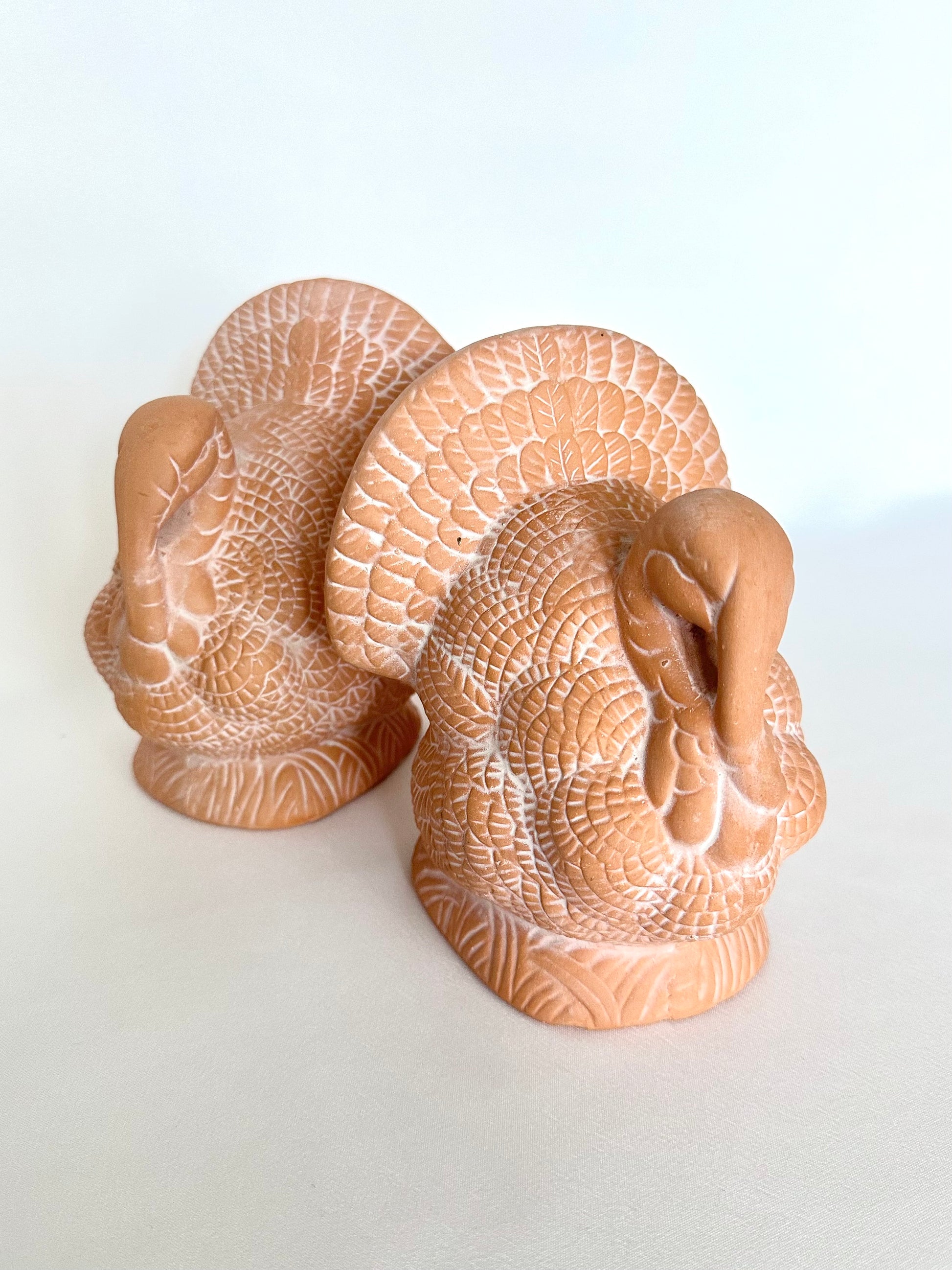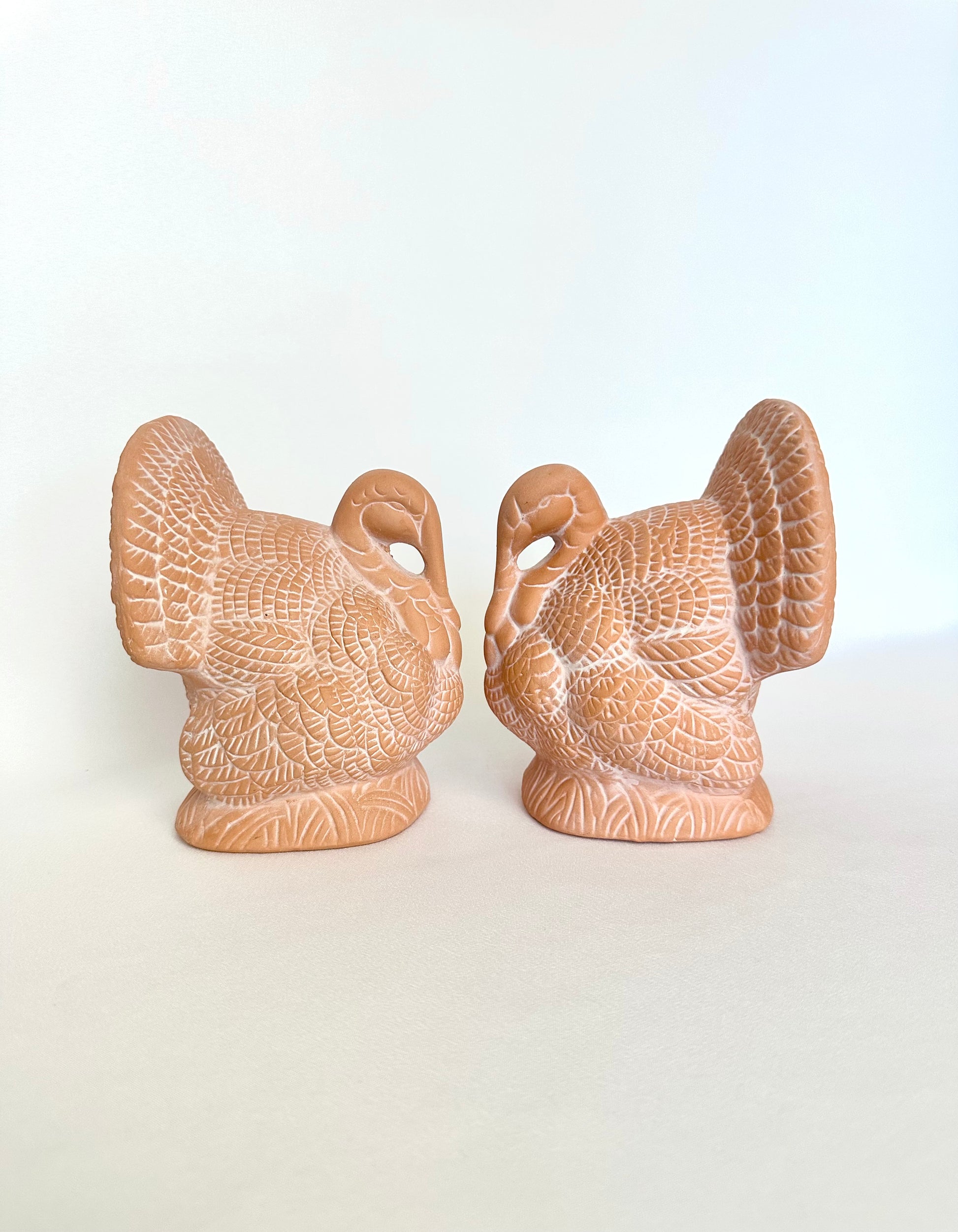 Textural and a bit earthy, this pair of terracotta turkeys would nicely balance your Thanksgiving table centerpiece! They are simply detailed and their "neutral" color works wonderfully with any holiday decorating scheme. Lightweight and hollow inside. A great choice for the Thanksgiving minimalist!
