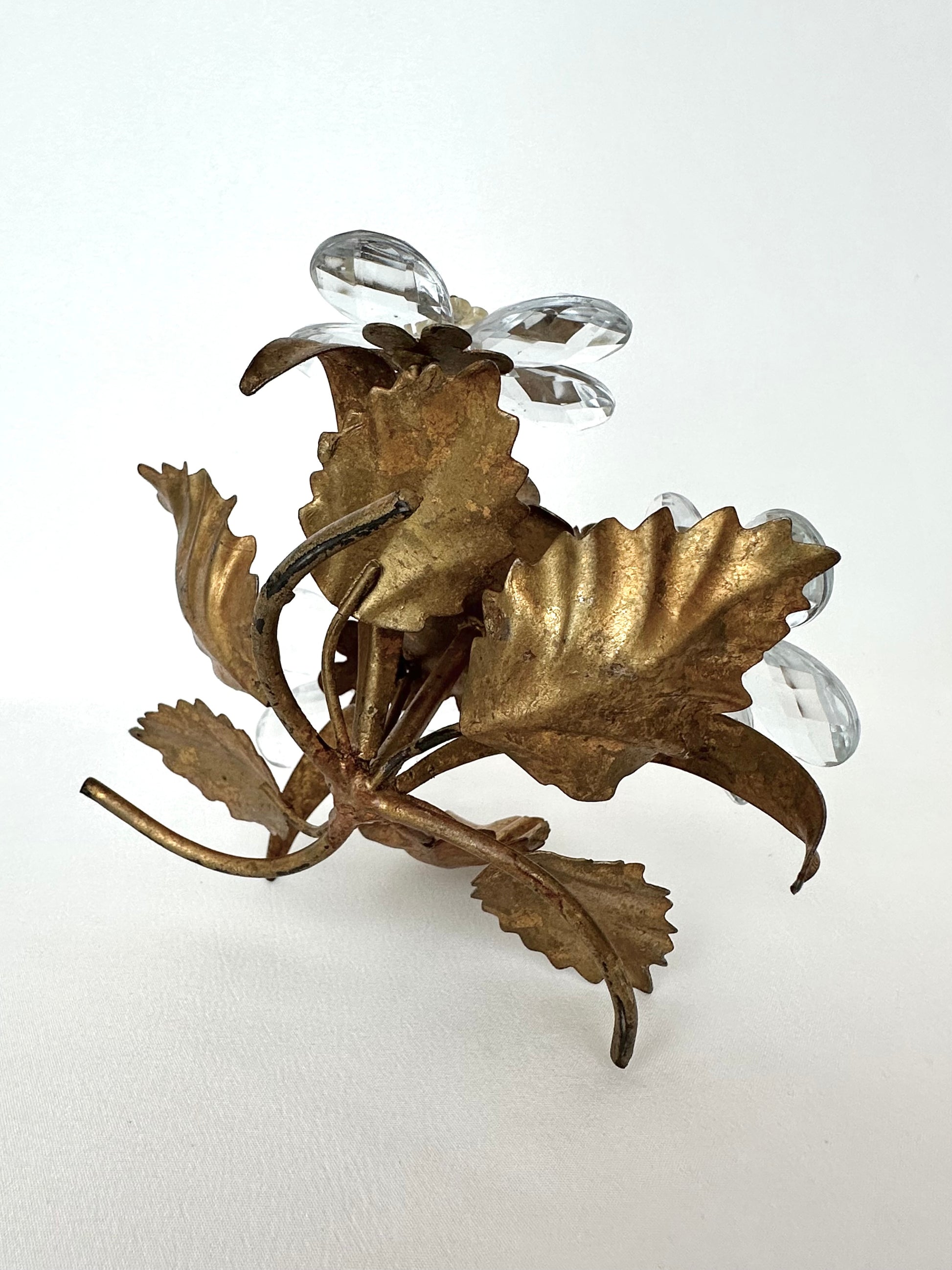 Italian tole and crystal candlestick holders for the win! Quite stunning, these gilded, ornate beauties feature leaf shapes and flowers made of crystal prisms for extra sparkle. Each holder has nine leaves in two different styles and 3 crystal flowers. The candle cups are comprised of four upright small leaves. A little rustic and a little Hollywood Regency glam! Fits standard sized taper candles.