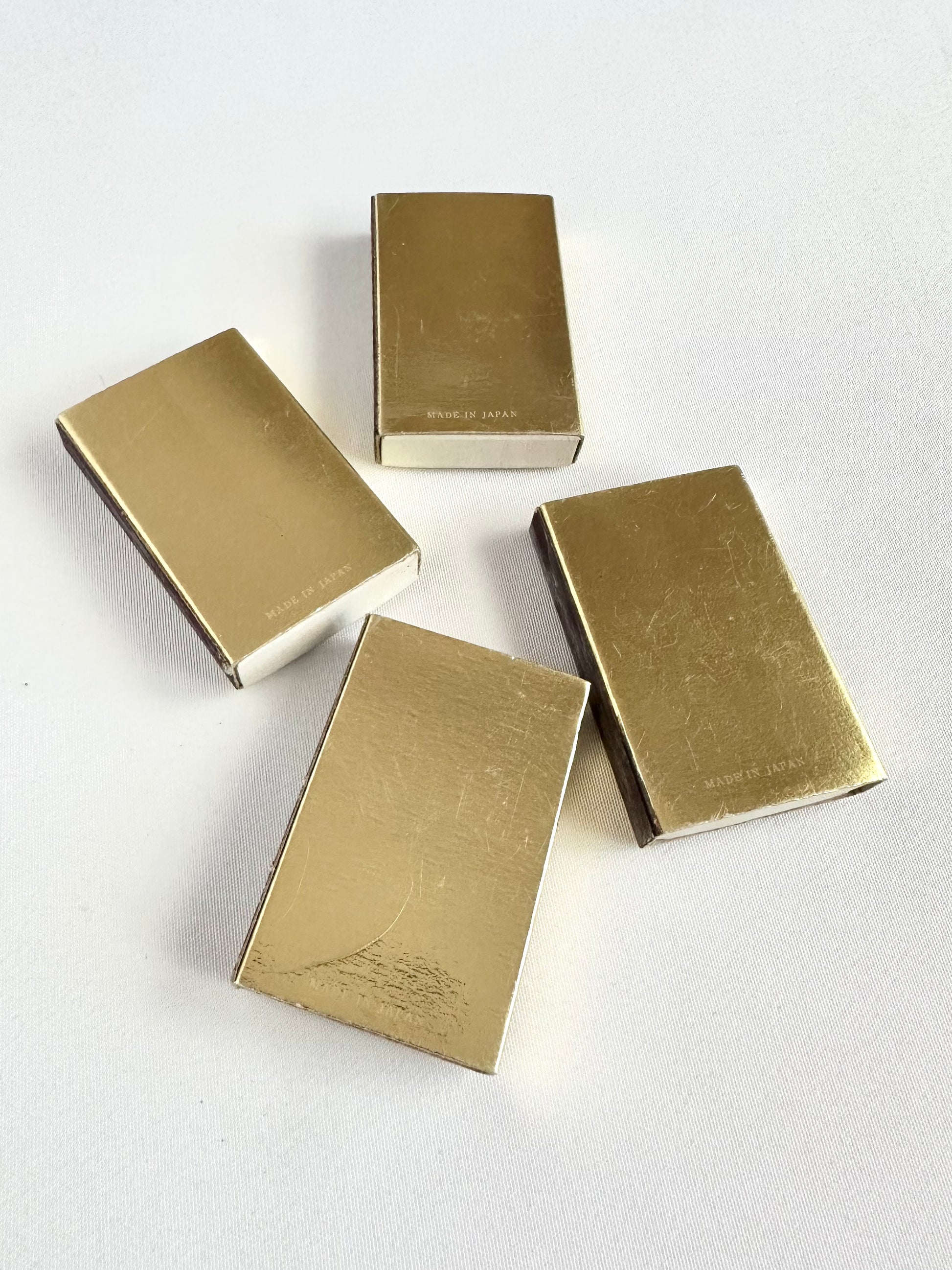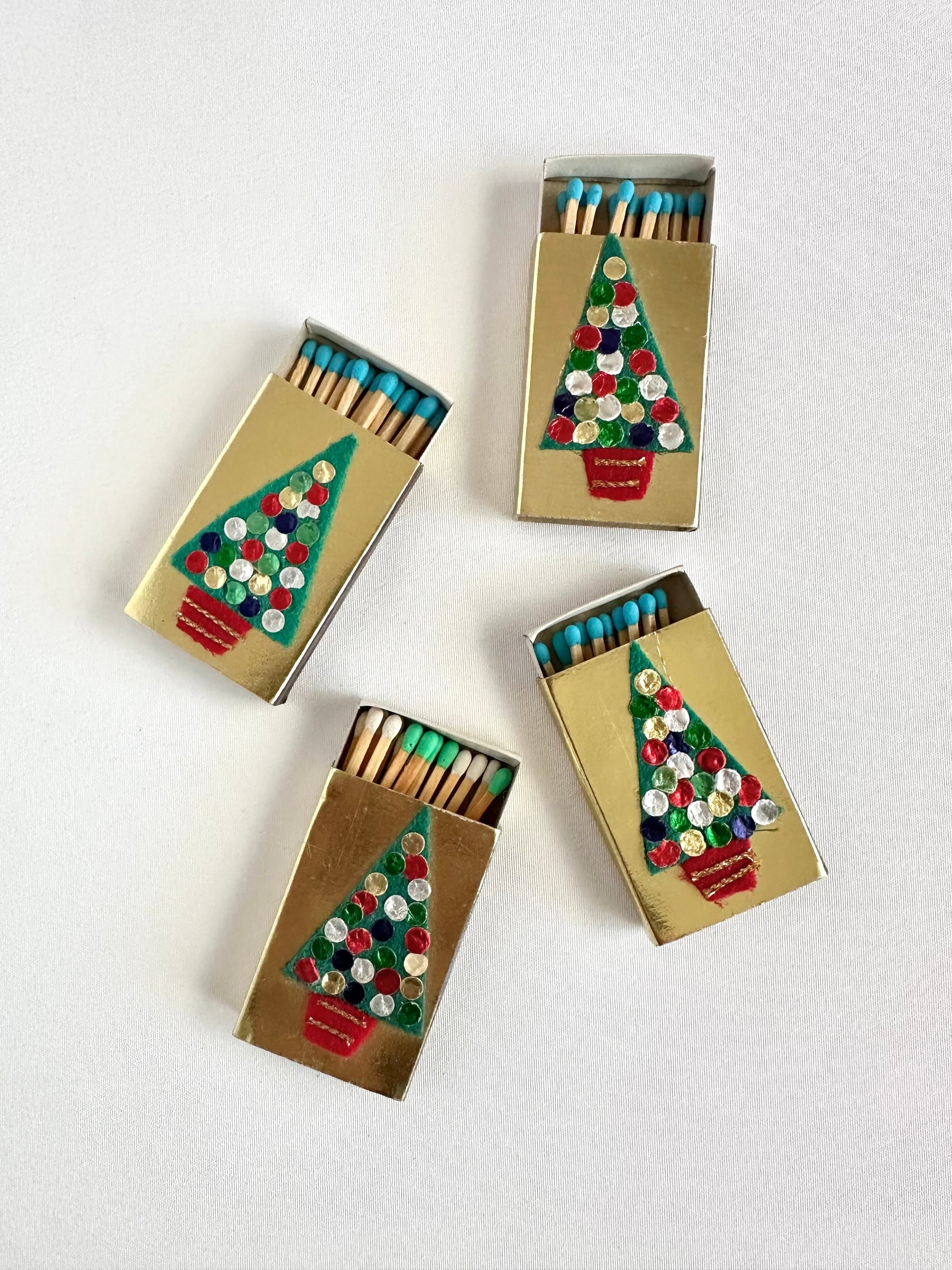 Every corner of your home deserves a little holiday accent! Our Faith Match Vessel set combines an aged transferware cup with four gold Christmas tree decorated matchboxes. These precious matchboxes from the 1960's have hand-applied ornaments and trimmings that give them a textural style. Each matchbox contains matches; they show slight signs of use. Fun little table accent!
