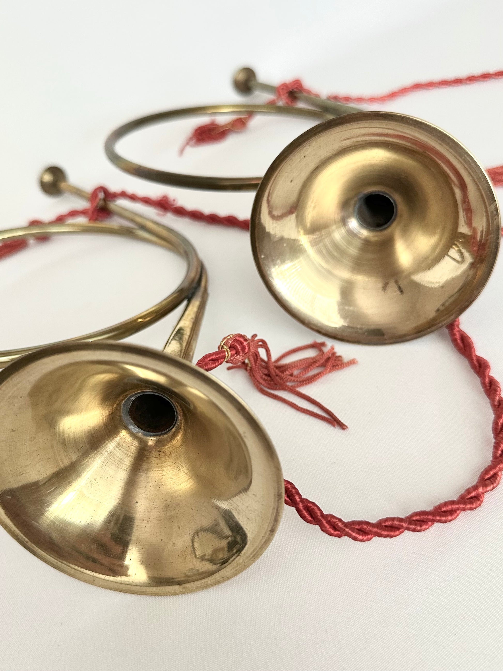 A classic French horn pair that can be used for holiday decorating just about anywhere! Beautifully aged brass and braided silky rope tassels make them ready to hang from your door, china cabinet knob or mixed with swags of greenery for a fun take on a small wreath. A timeless nod to the carols of the season!
