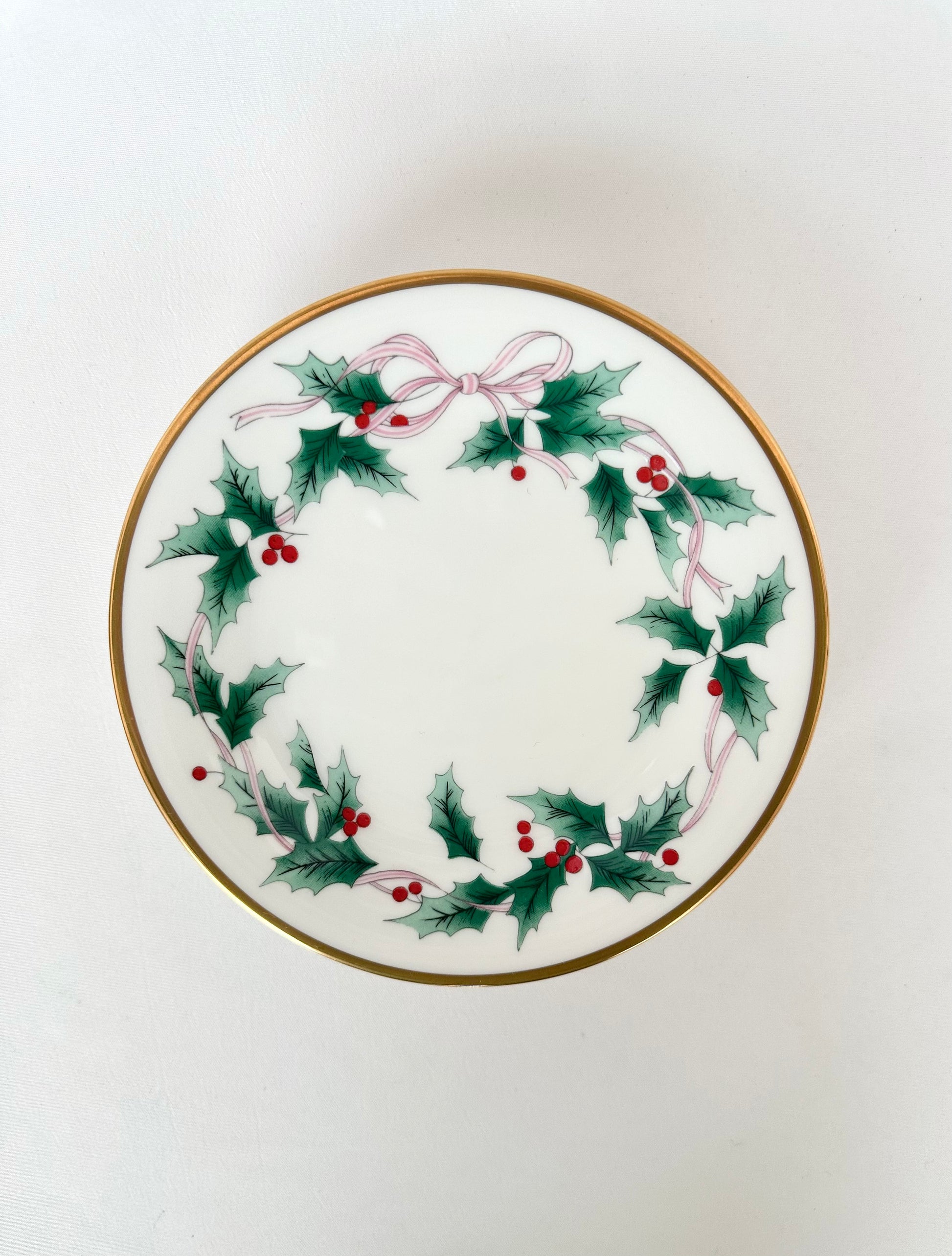 Festive and girl-dinner ready for your holiday get together! These beribboned plates work well for small bites, breakfast pastries or can layer into your other special tableware for bread & butter. Holly, pink ribbon, and gold — the perfect feminine Christmas trio!
