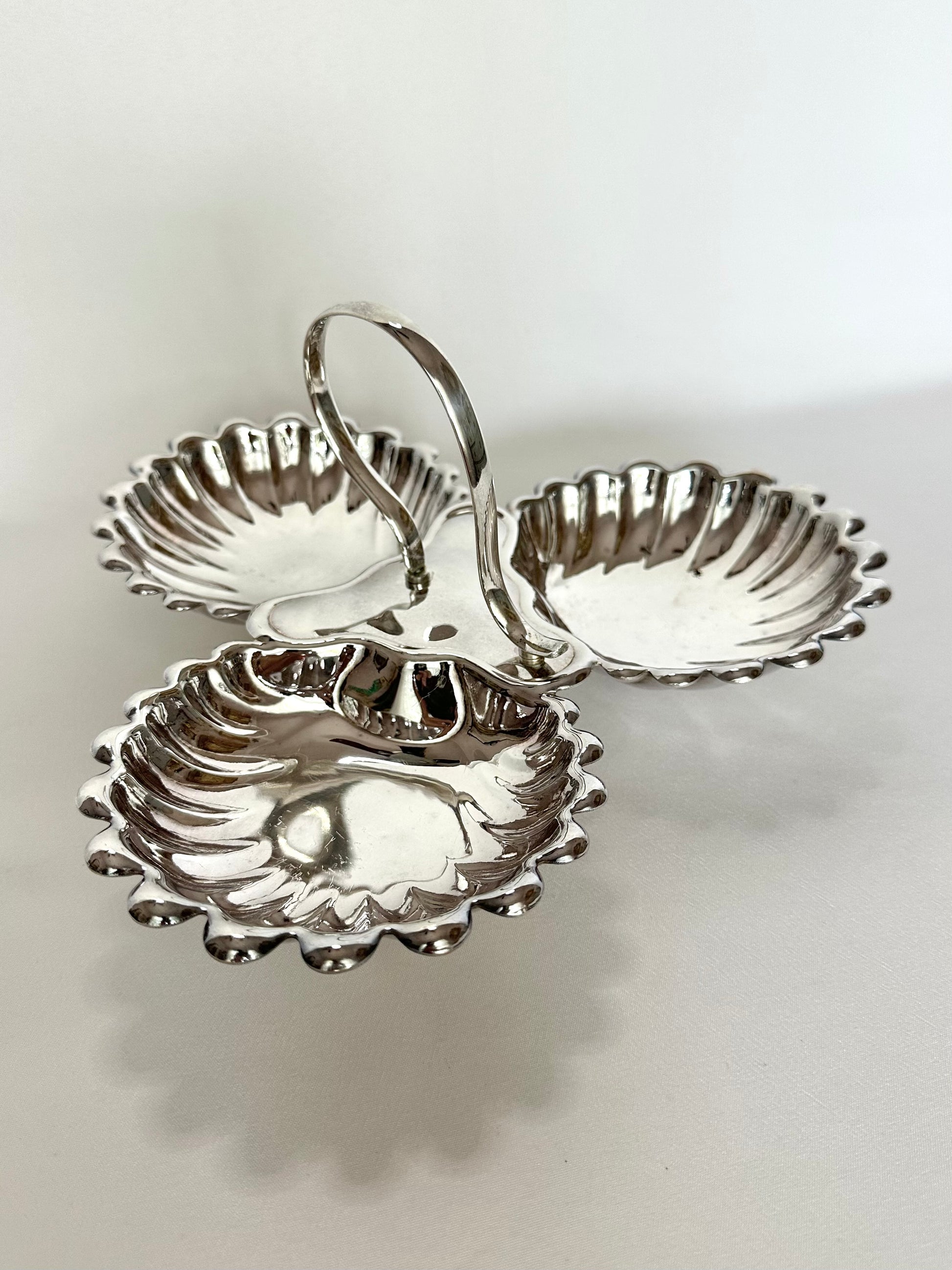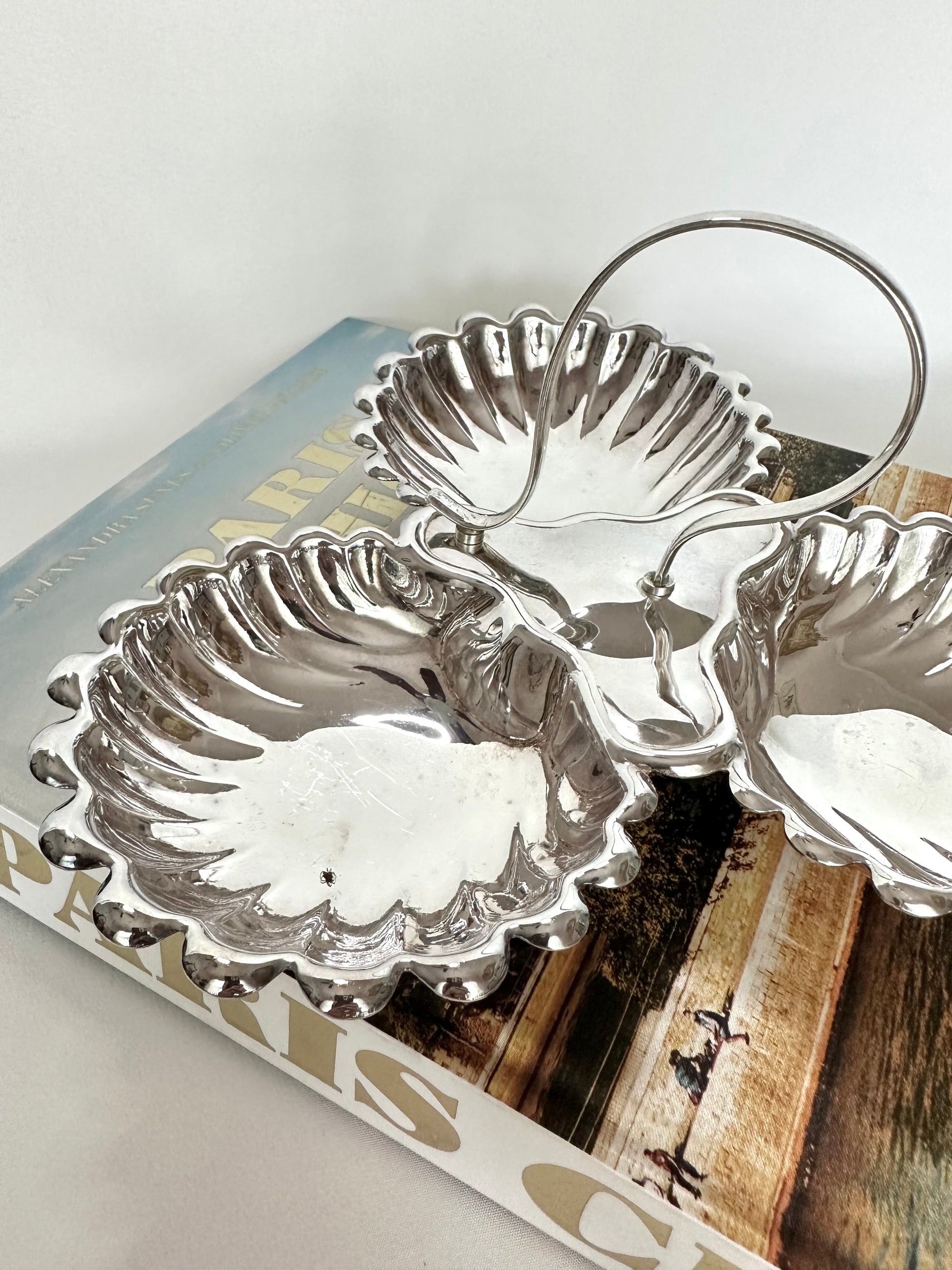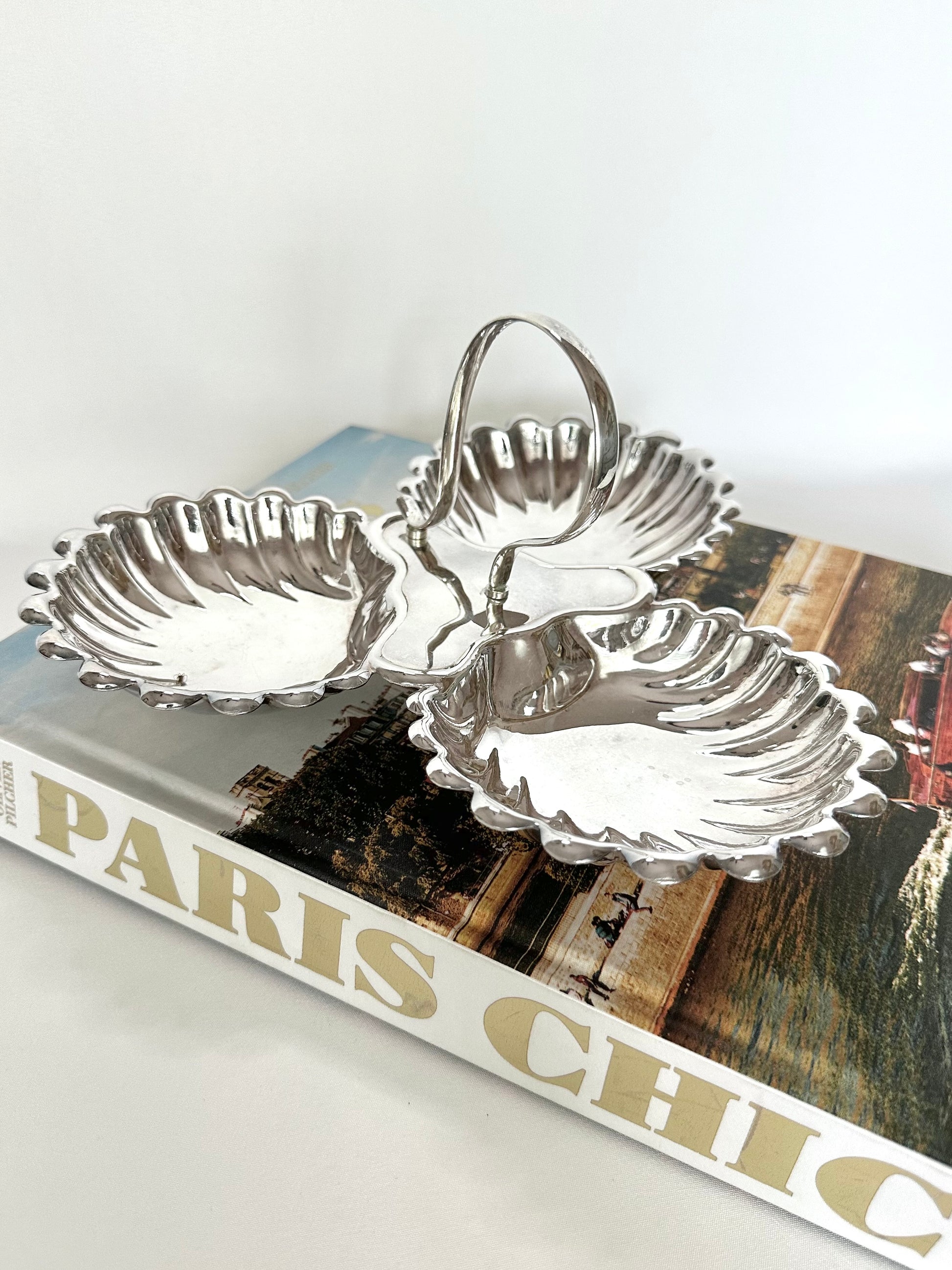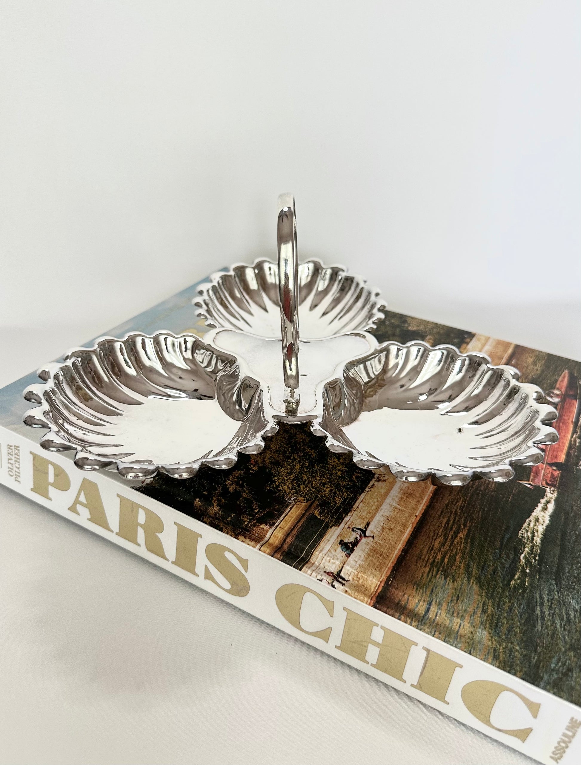 Nothing more chic to serve up your salty nibbles during aperitivo hour than this three-part shell server! Just add truffle chips, marcona almonds, castelvetrano olives, friends and cocktails. Beautiful scalloped design and central handle for easy carrying.
