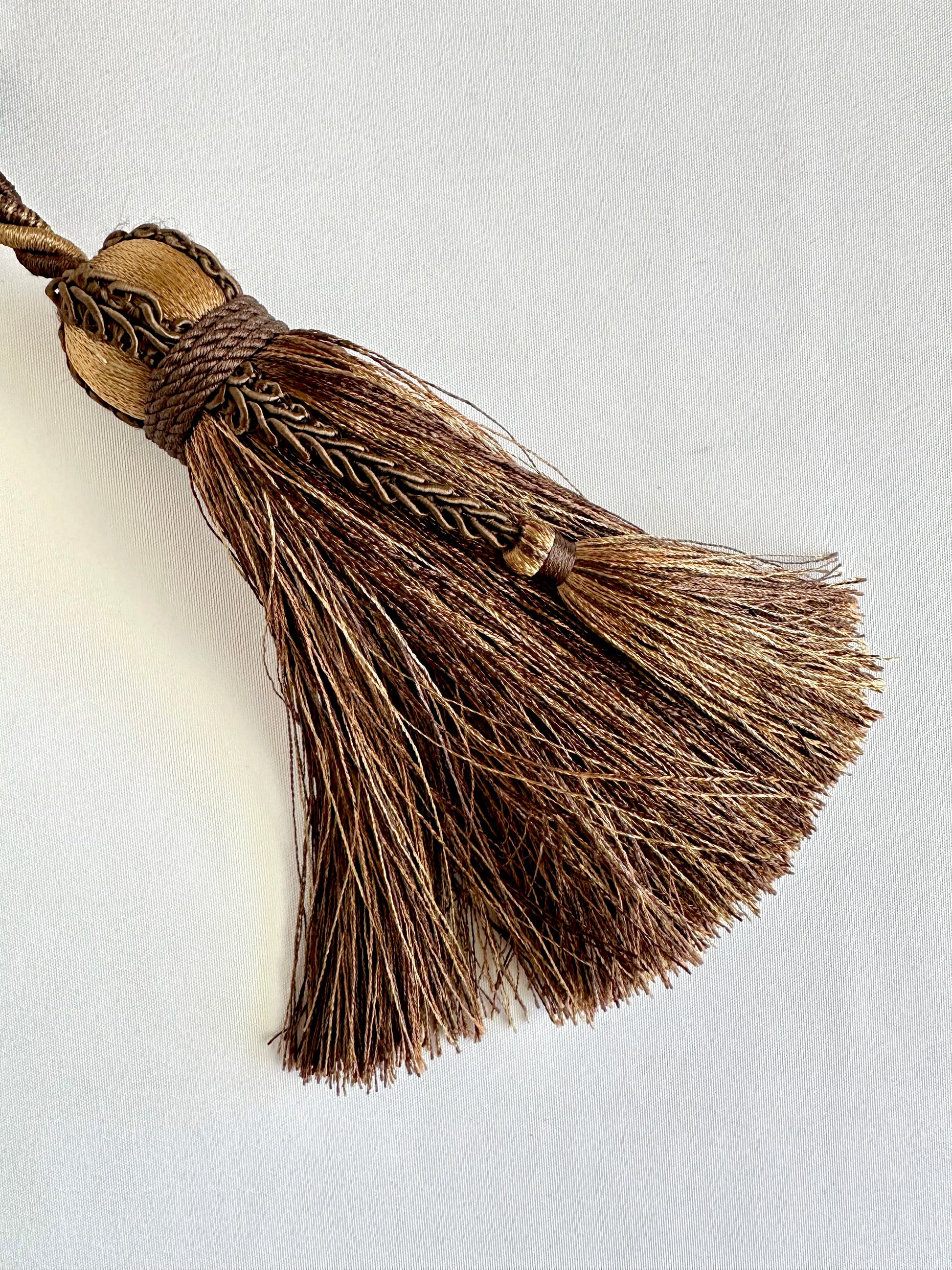 Our decorative tassel is a small detail that makes a big textural impact! Designed to add softness, character, and movement, it is ideal for styling cabinet knobs, keys, or home decor displays. A beautiful embellishment that adds charm and instantly enhances any space. This piece features a longer twisted loop anchored by a knot and double tassels in brown and gold with smaller tassels mixed into the fringe. Adjustable loop to suit your needs!