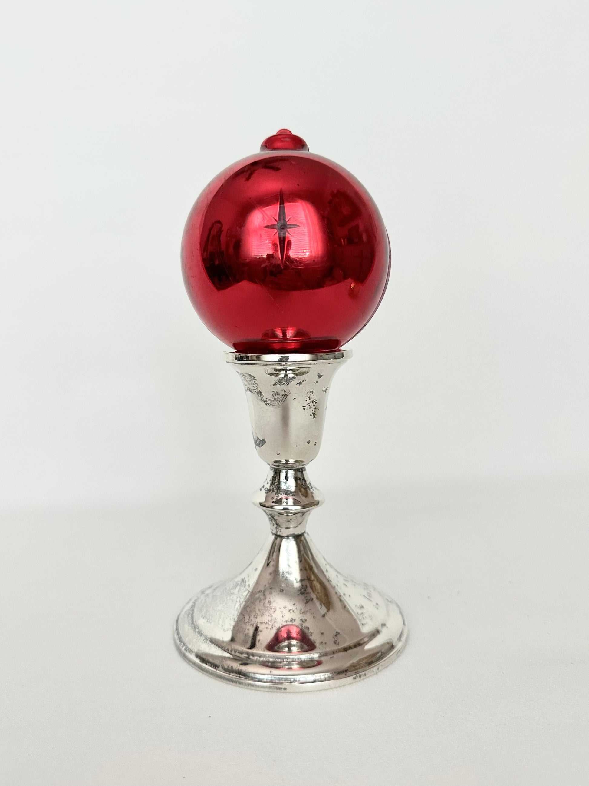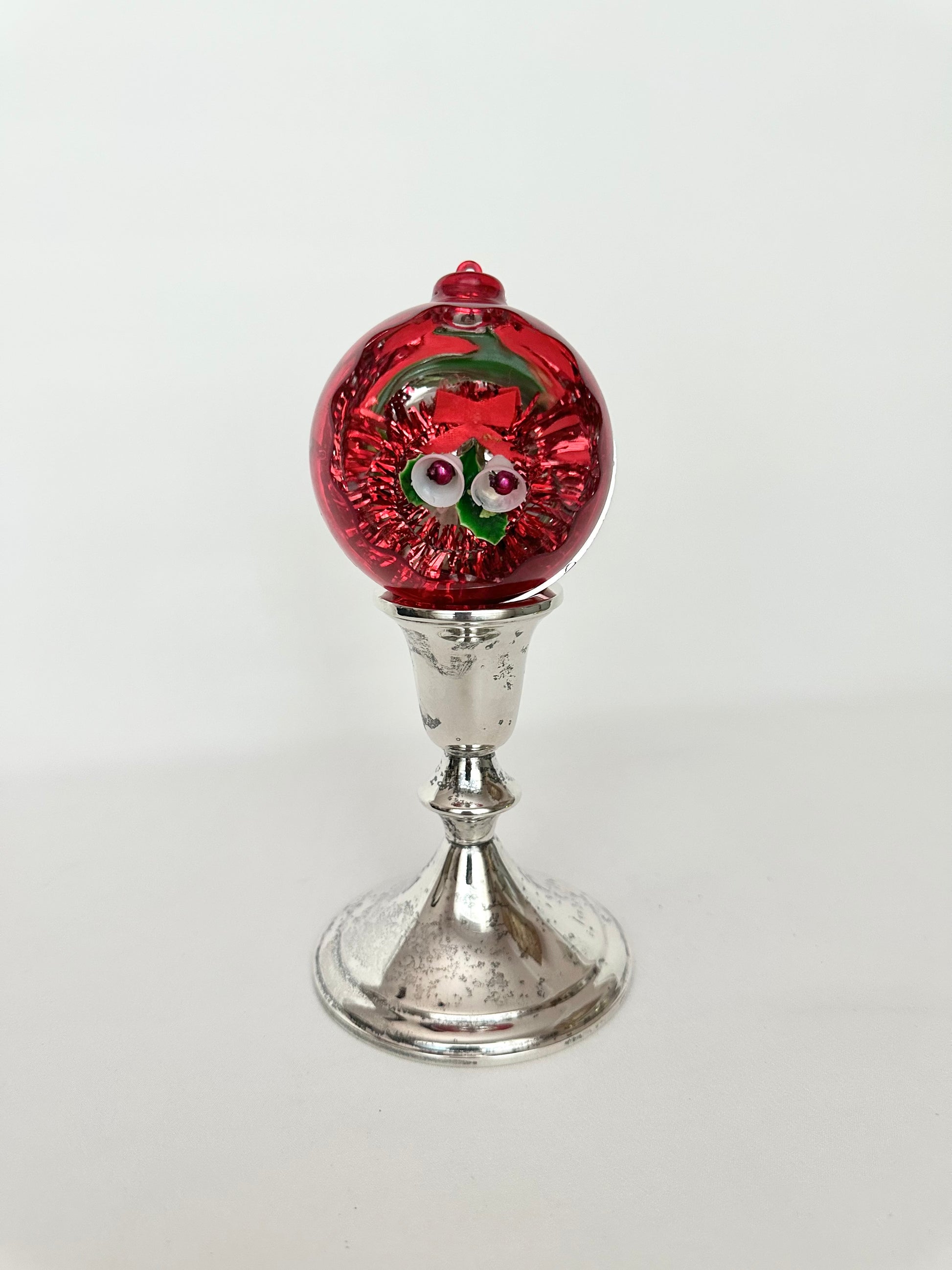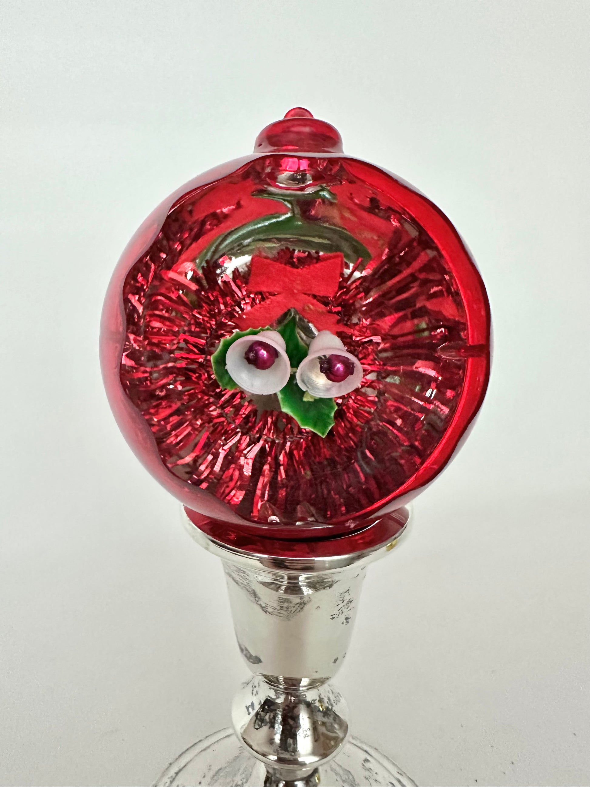 Vintage holiday magic — worn edges, soft shimmer, and the warmth of cherished memories. The Jewel Brite Diorama ornament duo, a mid-century treasure featuring a tiny tinsel wreath "scene" encased in both a sparkling red and yellow. True Christmas kitsch!