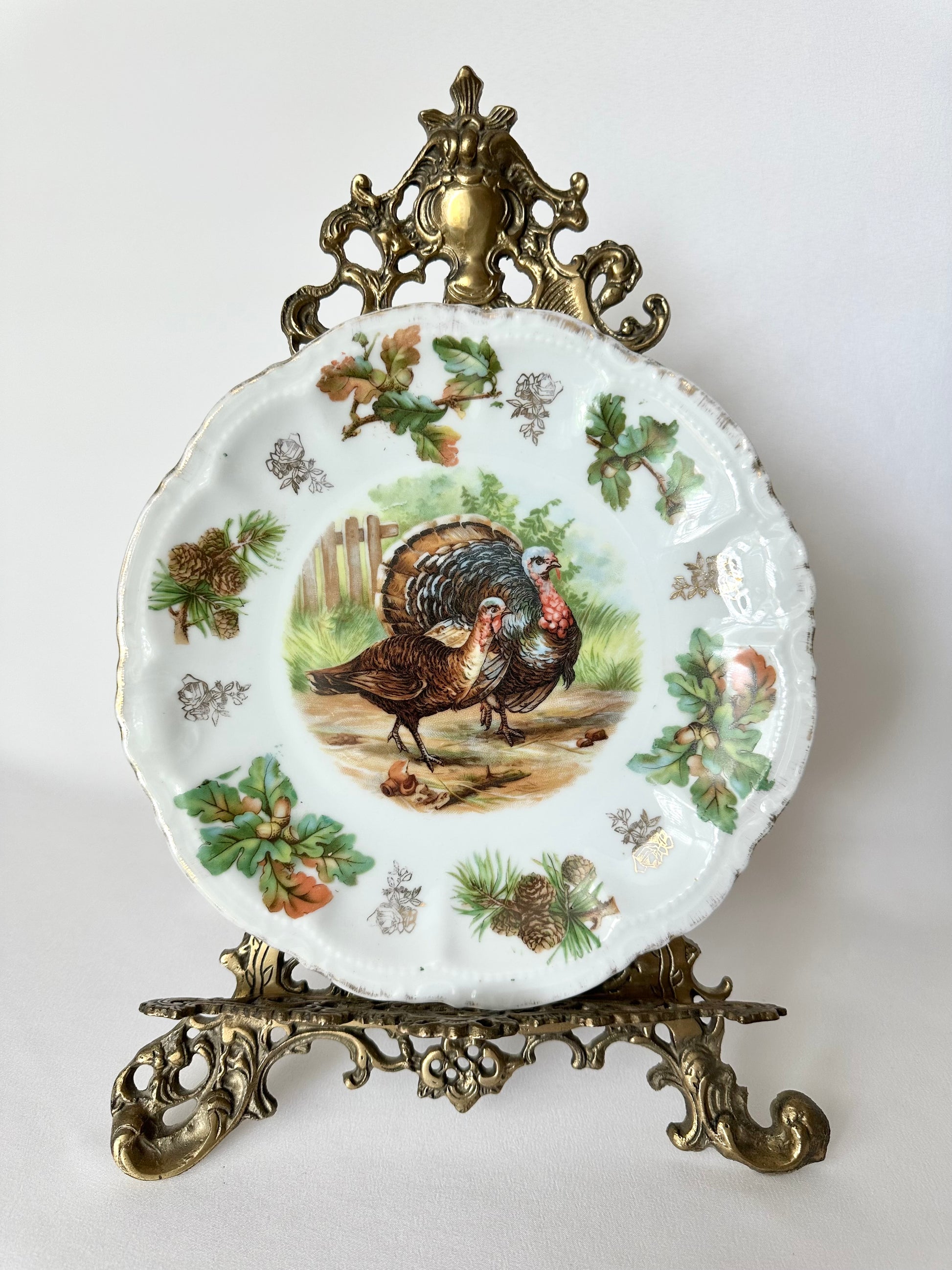 This Bavarian plate from the early 20th century adds a bit of woodsy, wild game nostalgia to your space. Perched on an easel, our Tucker plate is the perfect accent for your buffet side board this Fall! It features a handsome pair of turkeys, a scalloped time worn, gilded rim and foliage of the season. Ready to hang with holes on the back. For decorative use only.